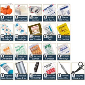 - Contains essential first-aid supplies to treat basic injuries as well as control major bleeding with extra supplies for multiple injuries